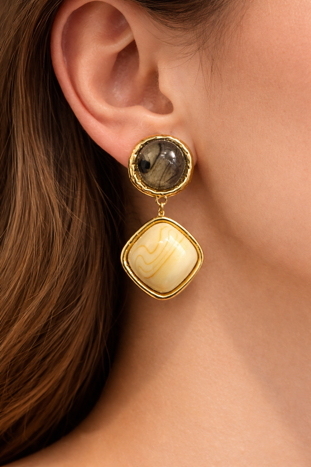 Aros de acero quirúrgico enchapados en oro 14k con resina, diseño elegante y único para poder disfrutar en cualquier momento, waterproof, hipoalergénicos.